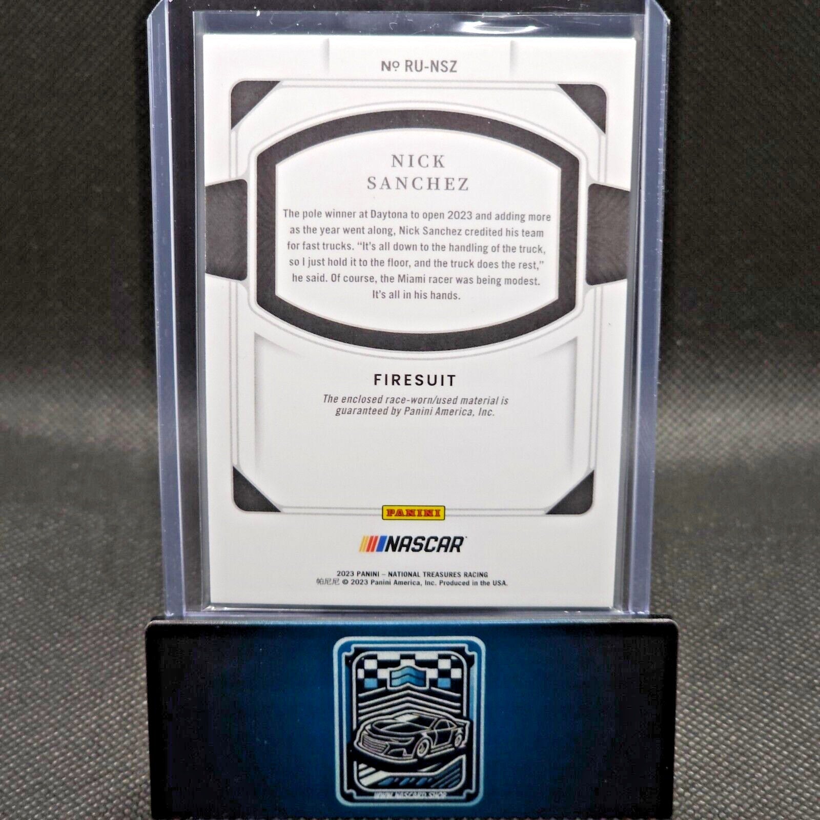 2023 Panini National Treasures Race Used Firesuit #RU-NSZ Nick Sanchez 49/99
