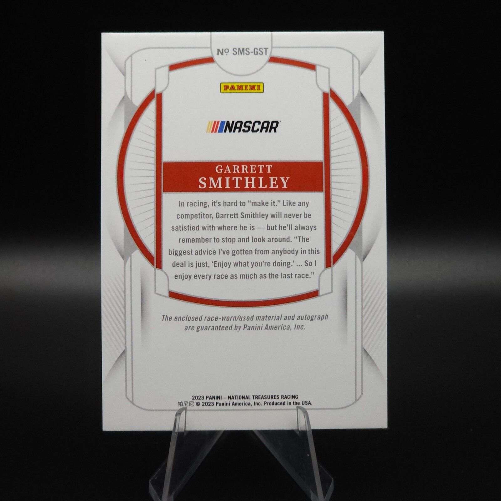 The product is a 2023 Panini National Treasures trading card featuring a sheet metal signature of NASCAR driver Garrett Smithley. The card is autographed and serial numbered out of 99 copies. It is part of the Sheet Metal Signatures insert set and was signed in hard format by Garrett Smithley himself. Produced by Panini, this card showcases a unique metal material and is authenticated by Panini Authentic.