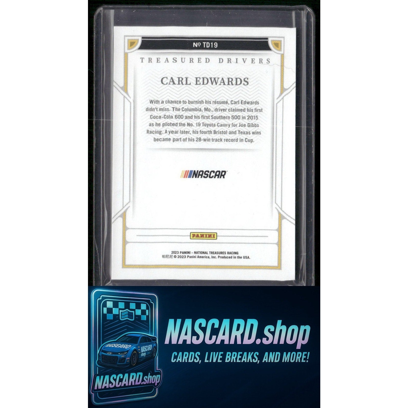 This is a nice example of a 2023 Panini National Treasures #TD19 Carl Edwards Treasured Drivers Green