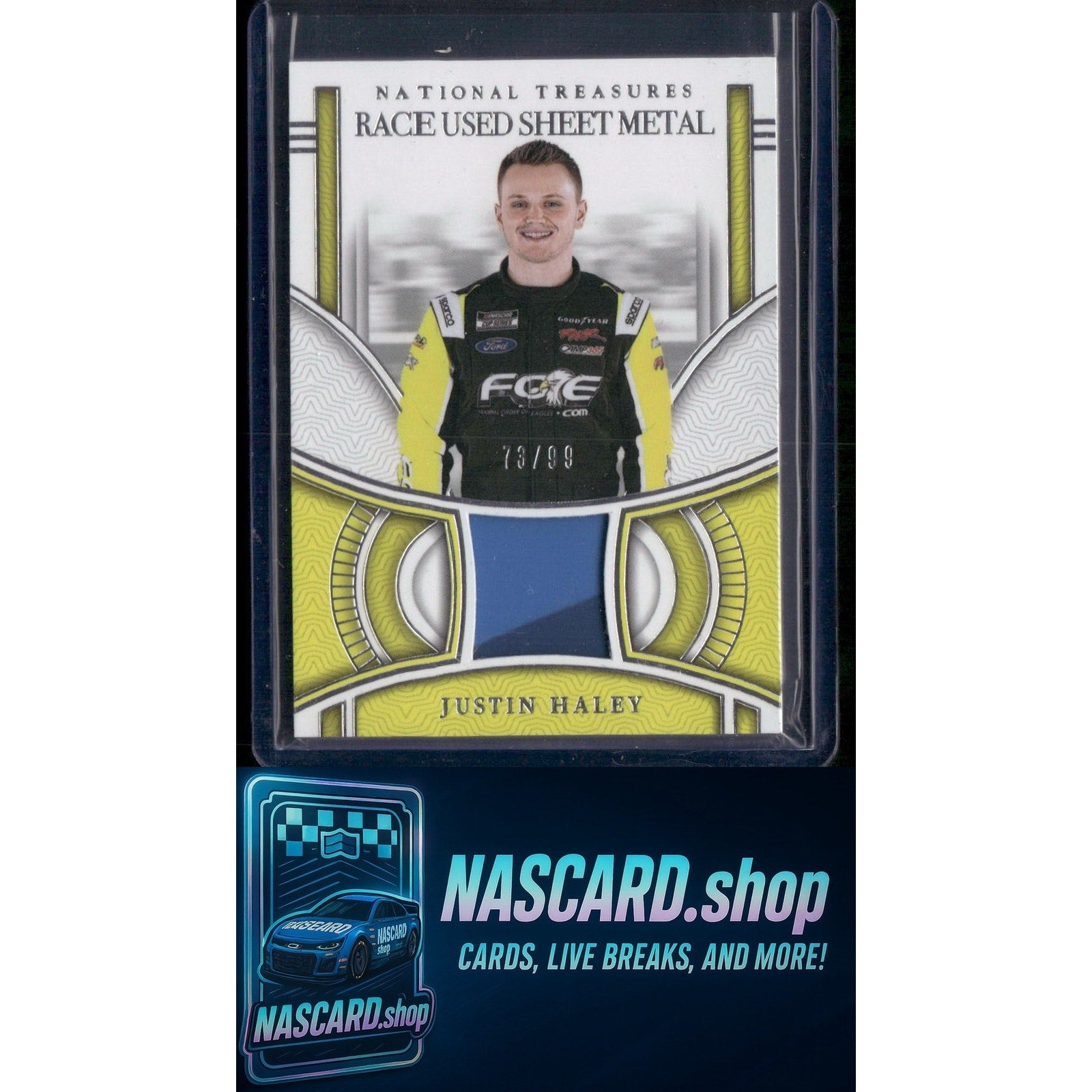 This is a nice example of a 2024 Panini National Treasures #RUS-JHY Justin Haley Race Used Sheet Metal