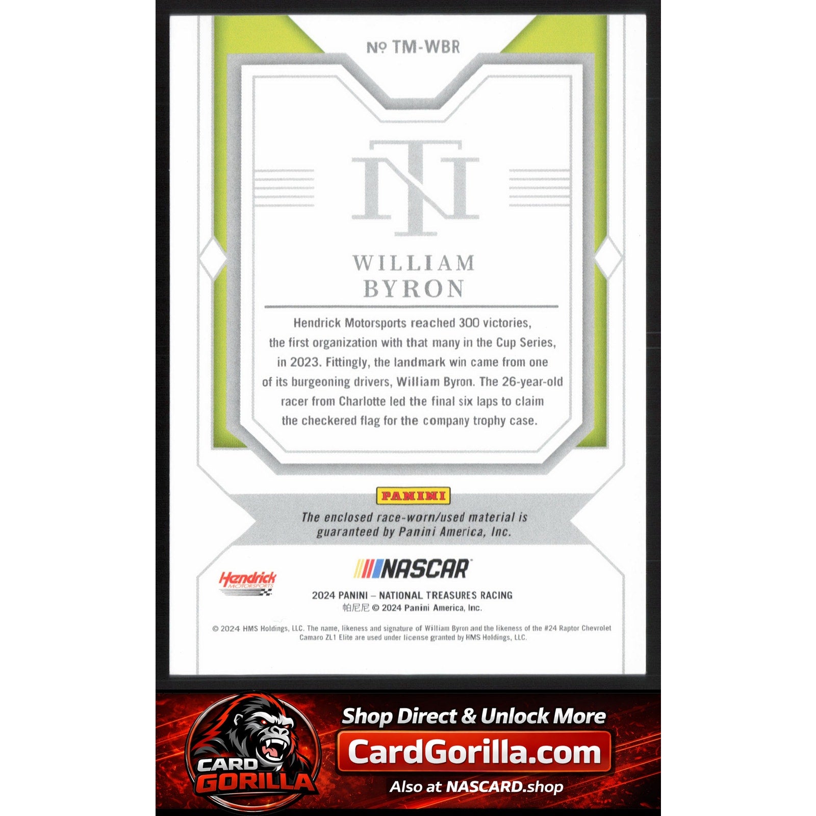 This is a nice example of a 2024 Panini National Treasures #TM-WBR William Byron Timeline Materials