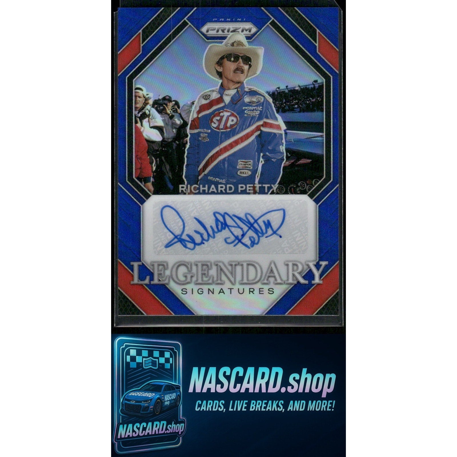 This is a nice example of a 2024 Panini Prizm #LS-RPT Richard Petty Legendary Signatures Blue