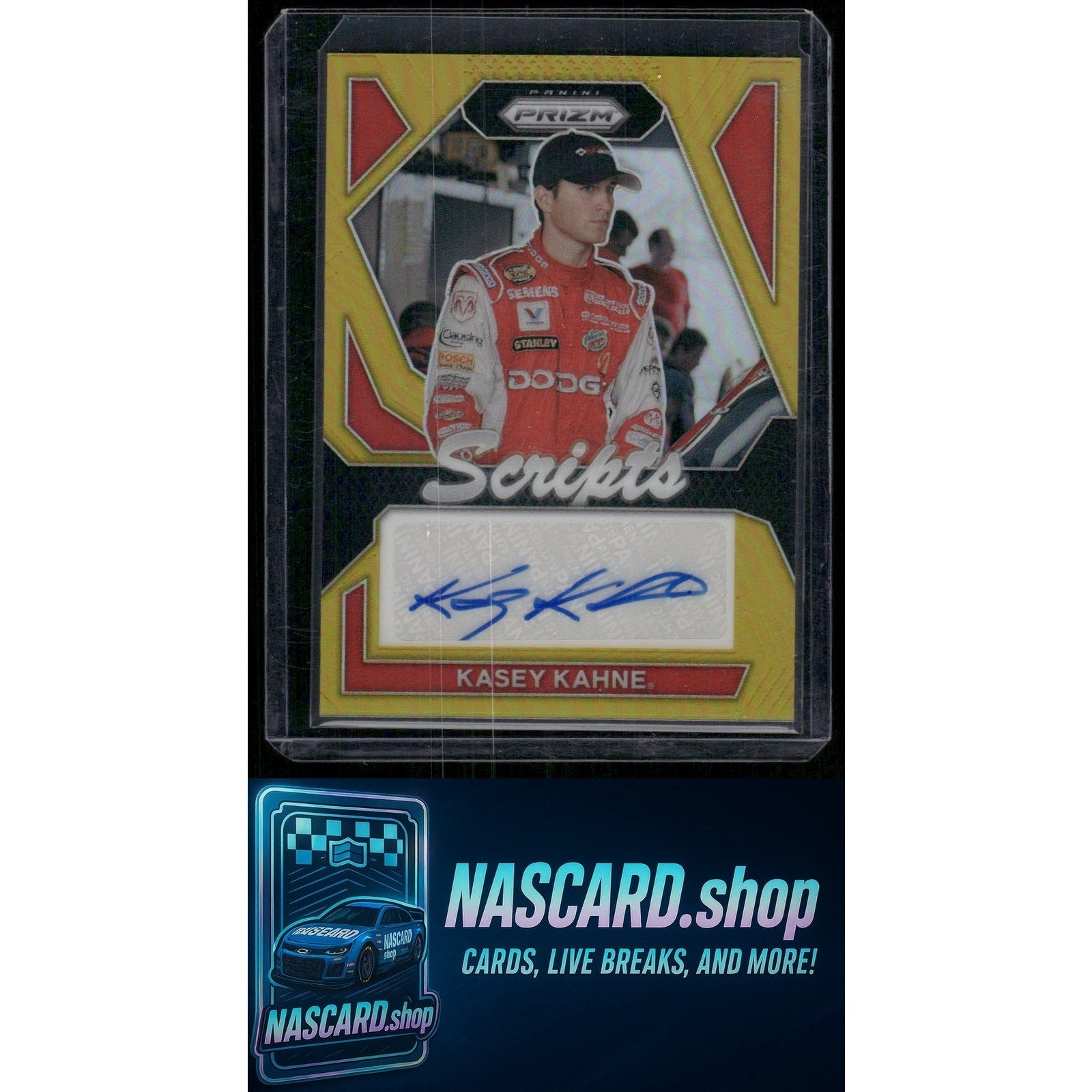This is a nice example of a 2024 Panini Prizm #S-KKE Kasey Kahne Scripts Gold
