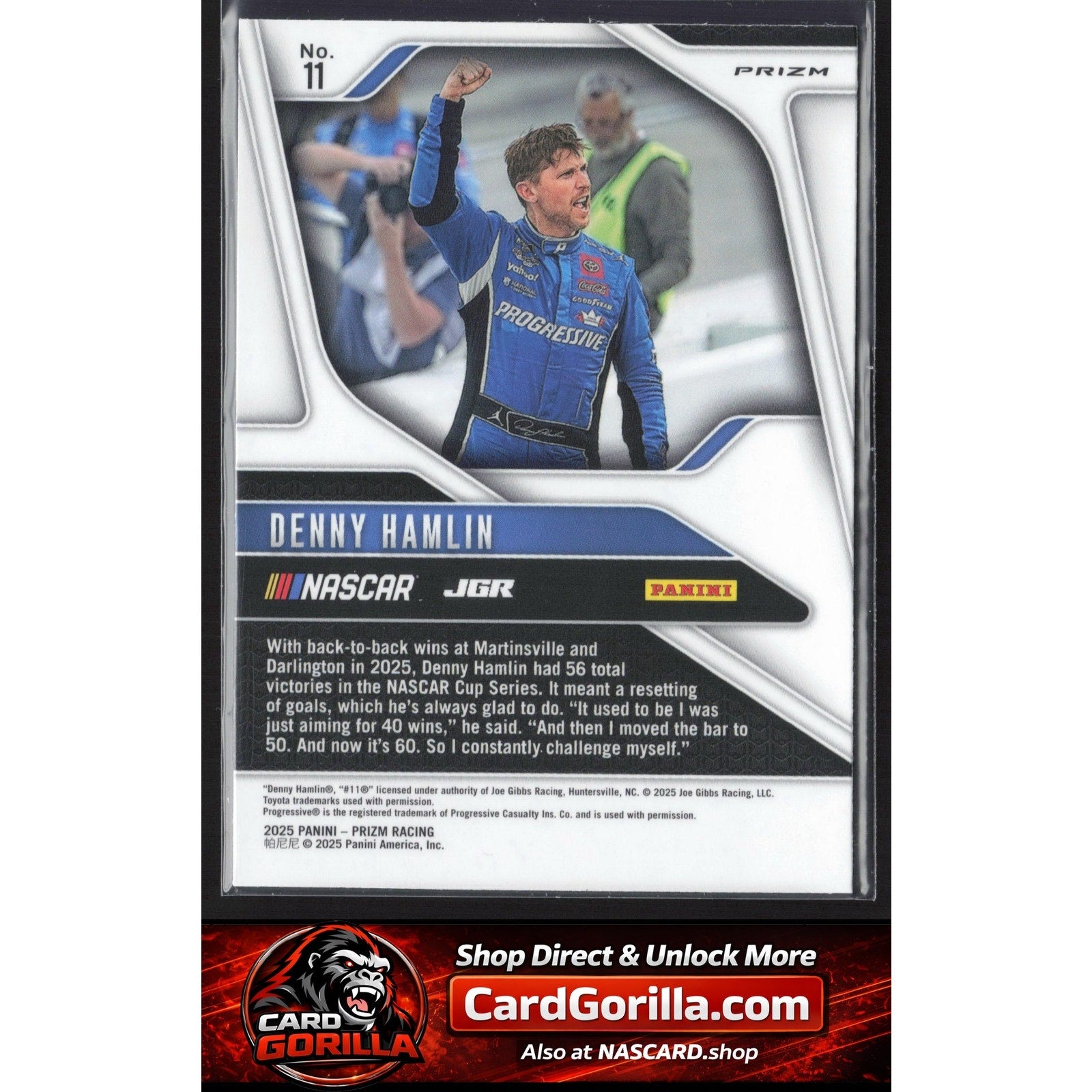 This is a nice example of a 2025 Panini Prizm #11 Denny Hamlin White Sparkle