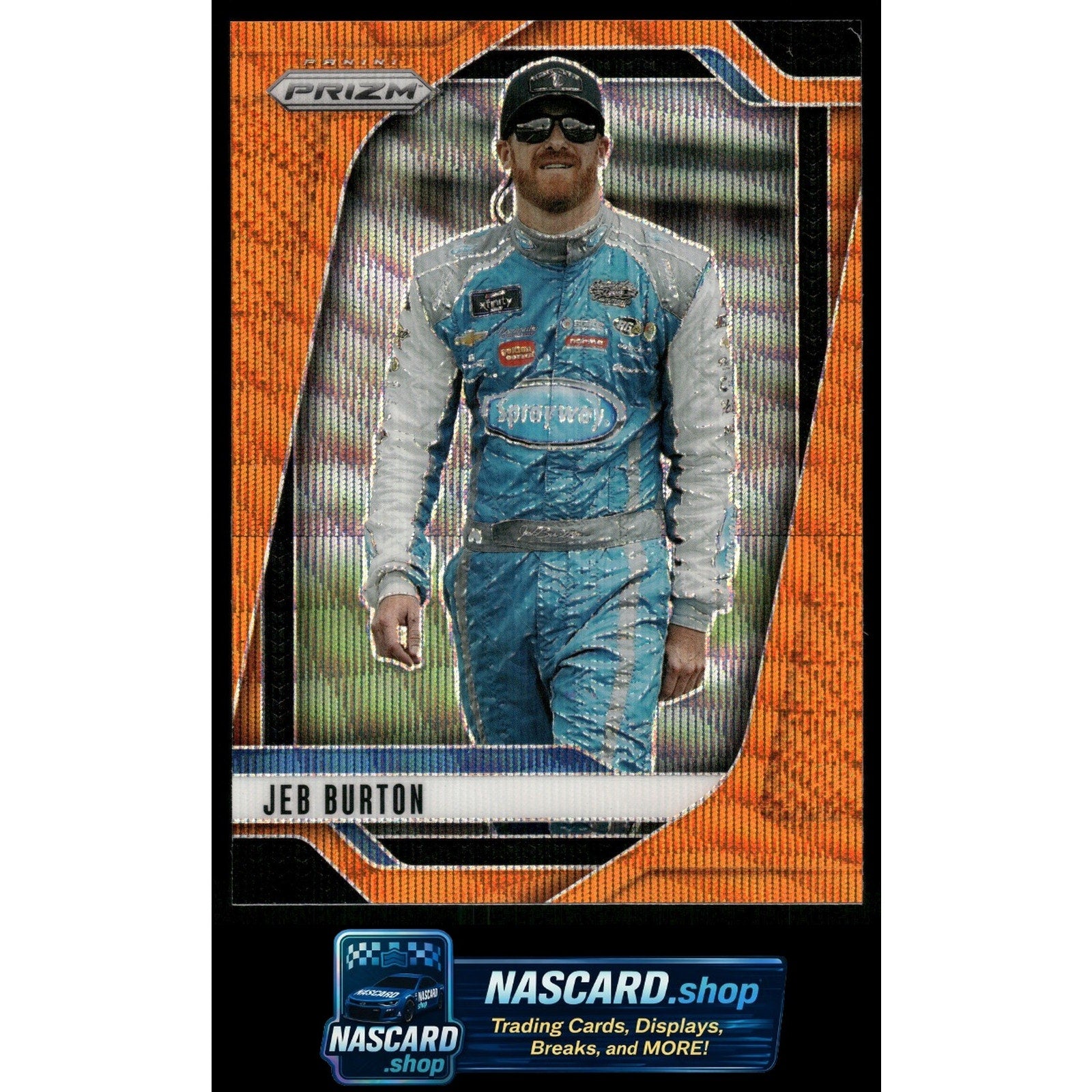 This is a nice example of a 2025 Panini Prizm #18 Jeb Burton Orange Wave