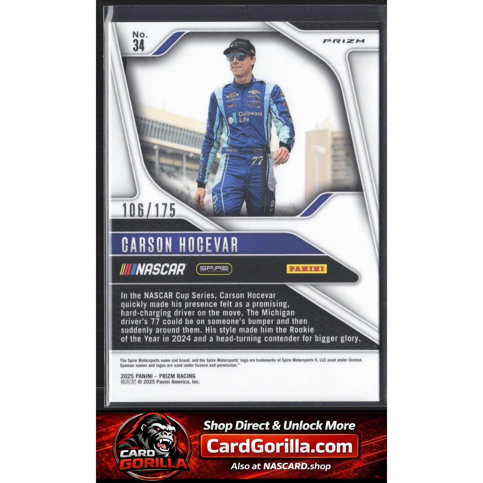 This is a nice example of a 2025 Panini Prizm #34 Carson Hocevar Red Power