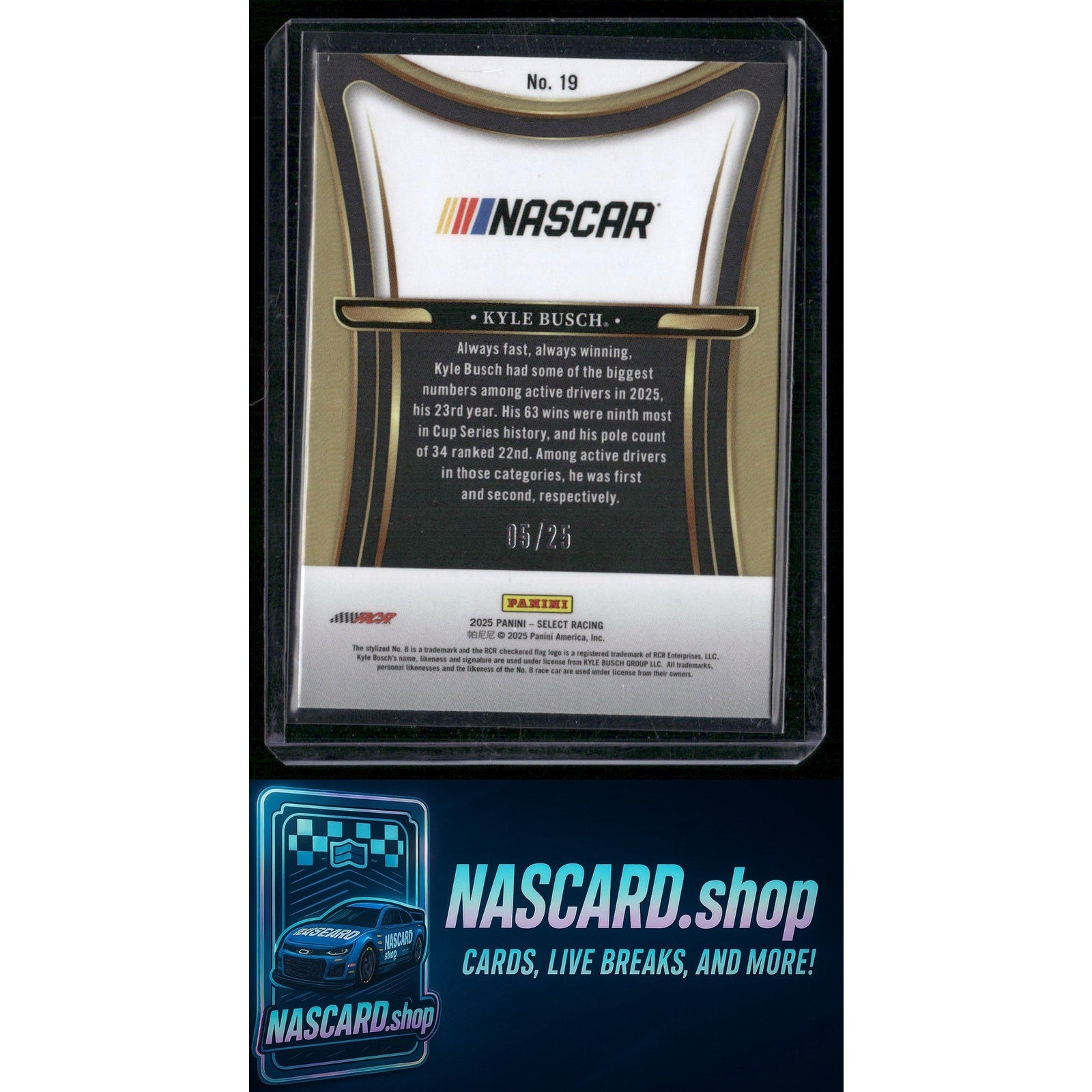 This is a nice example of a 2025 Panini Select #19 Kyle Busch Sensations Tie-Dye Prizms
