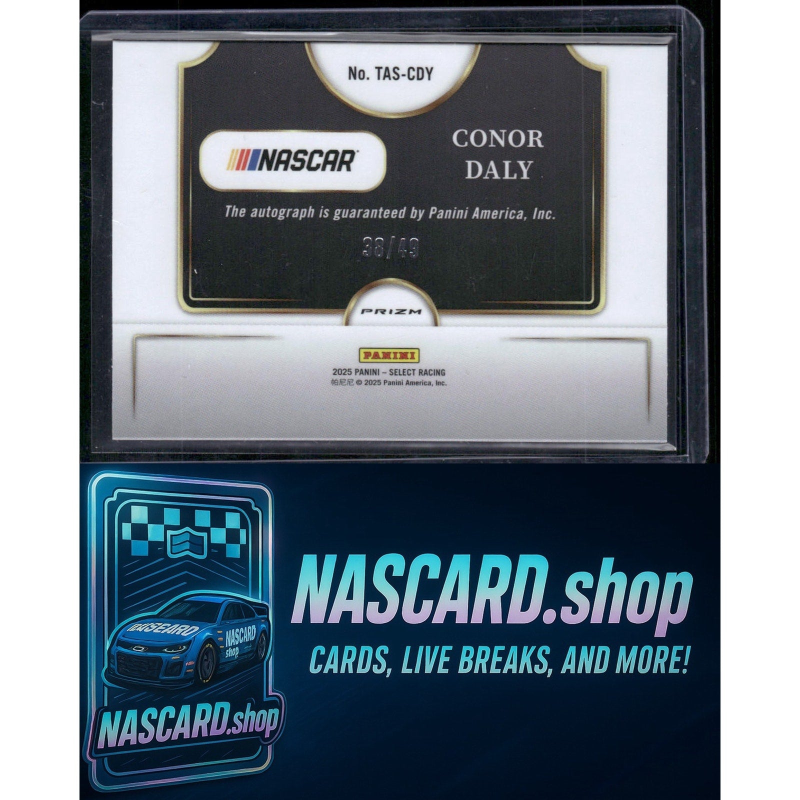 This is a nice example of a 2025 Panini Select #TAS-CDY Conor Daly Trackside Action Signatures Purple Prizms