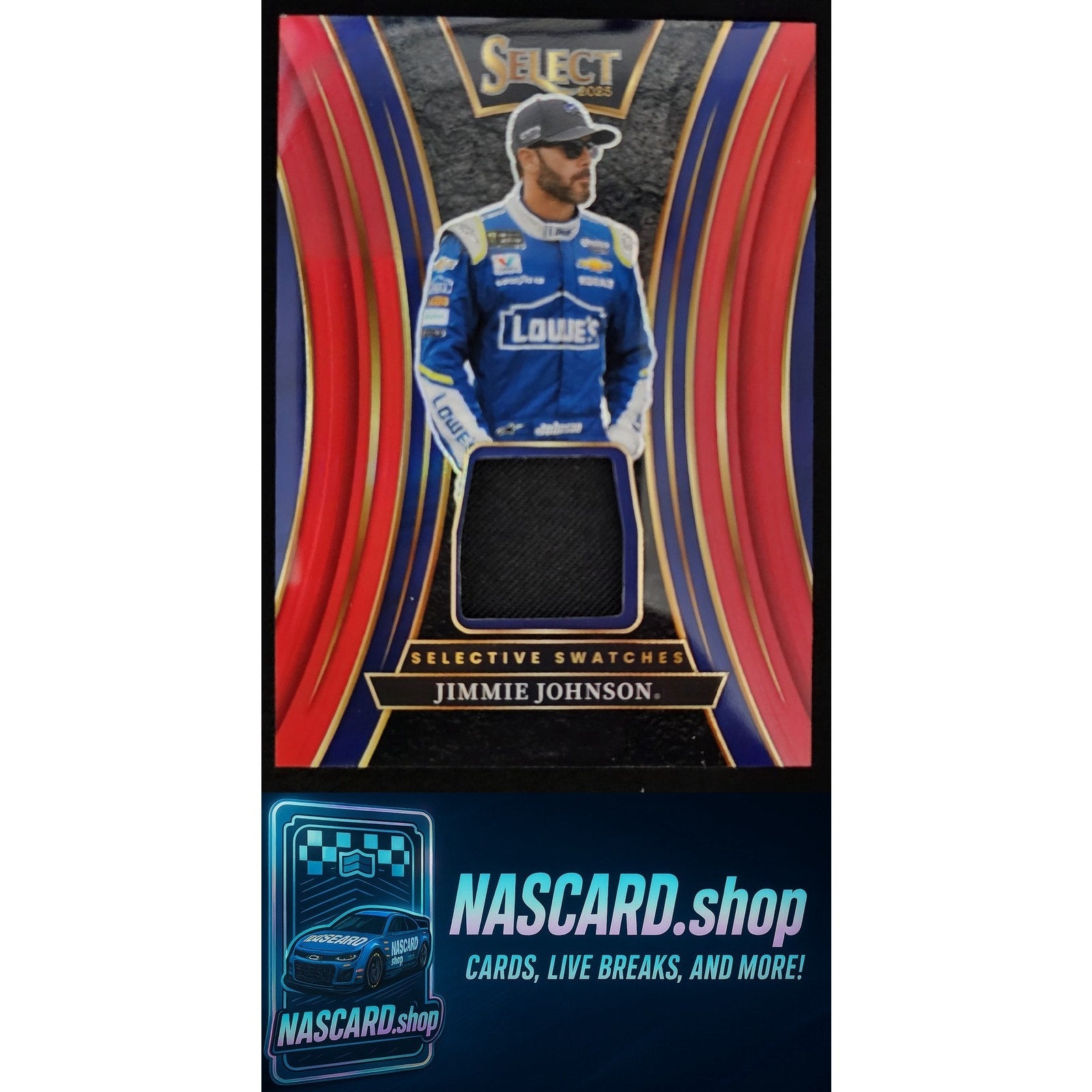 This is a nice example of a 2025 Panini Select #SS-JJN Jimmie Johnson Selective Swatches Red Prizms