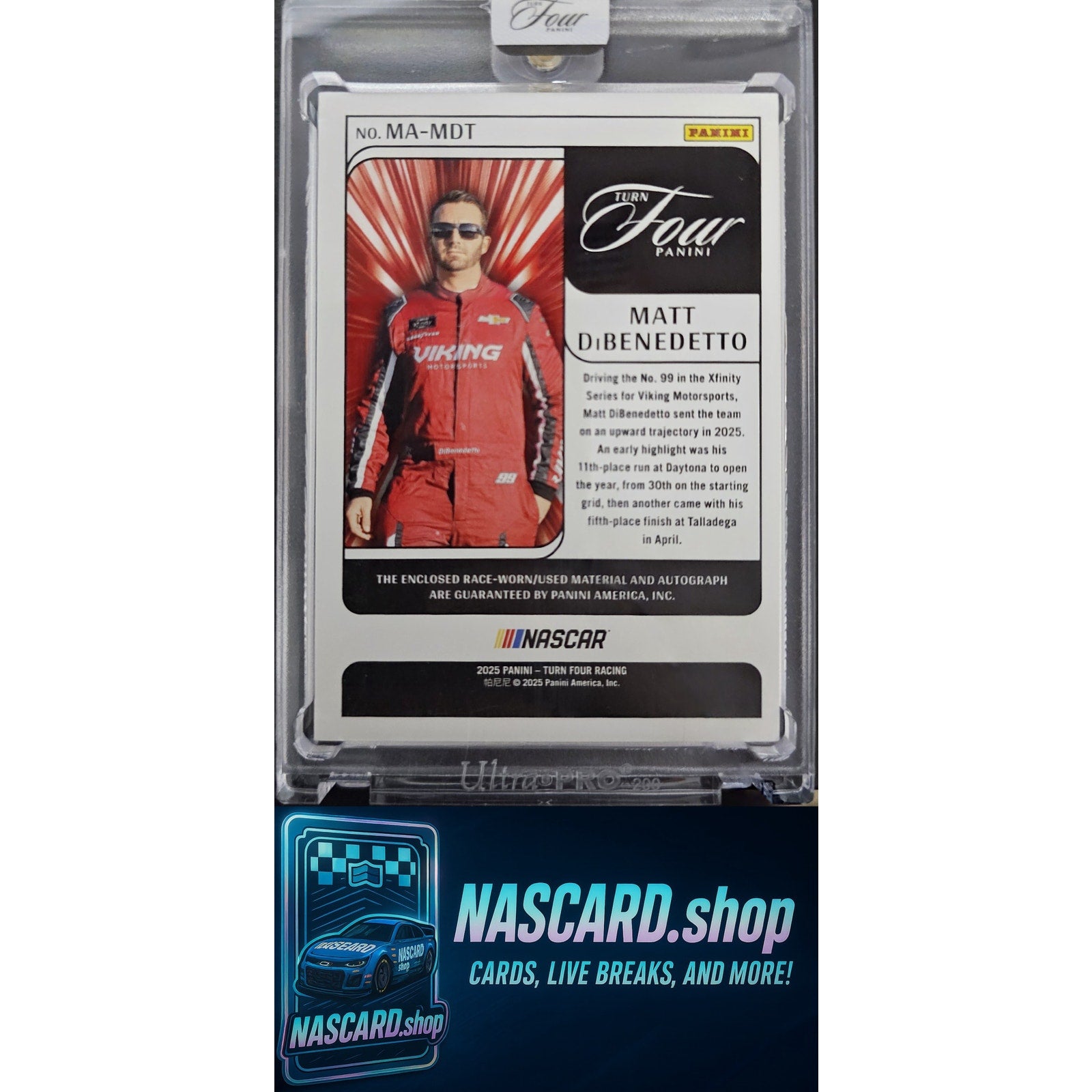 This is a nice example of a 2025 Panini Turn Four #MA-MDT Matt DiBenedetto Memorabilia Autographs Purple